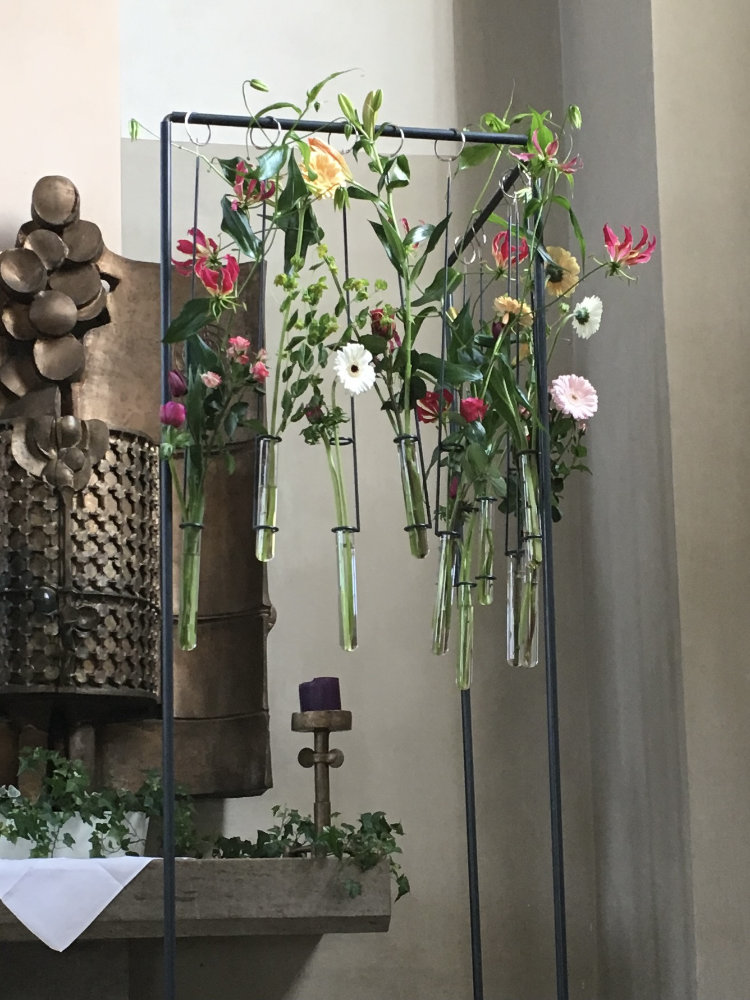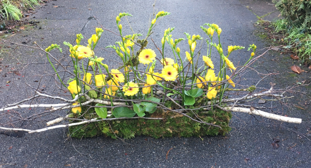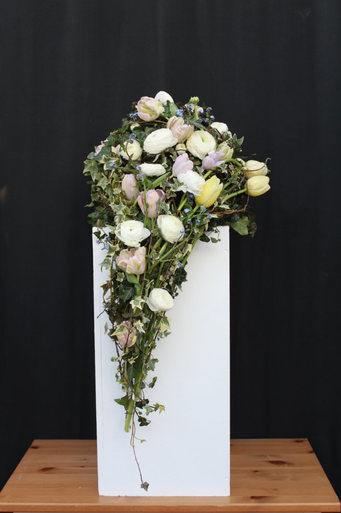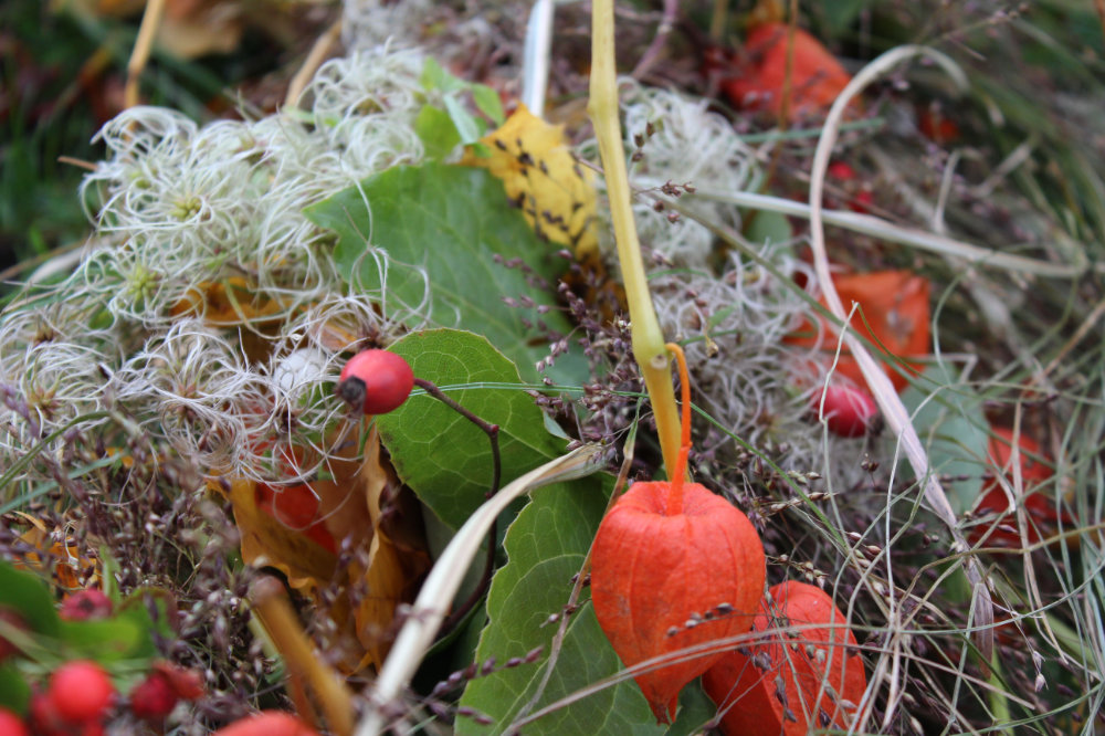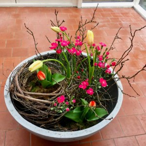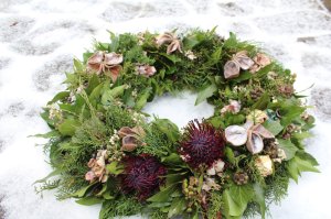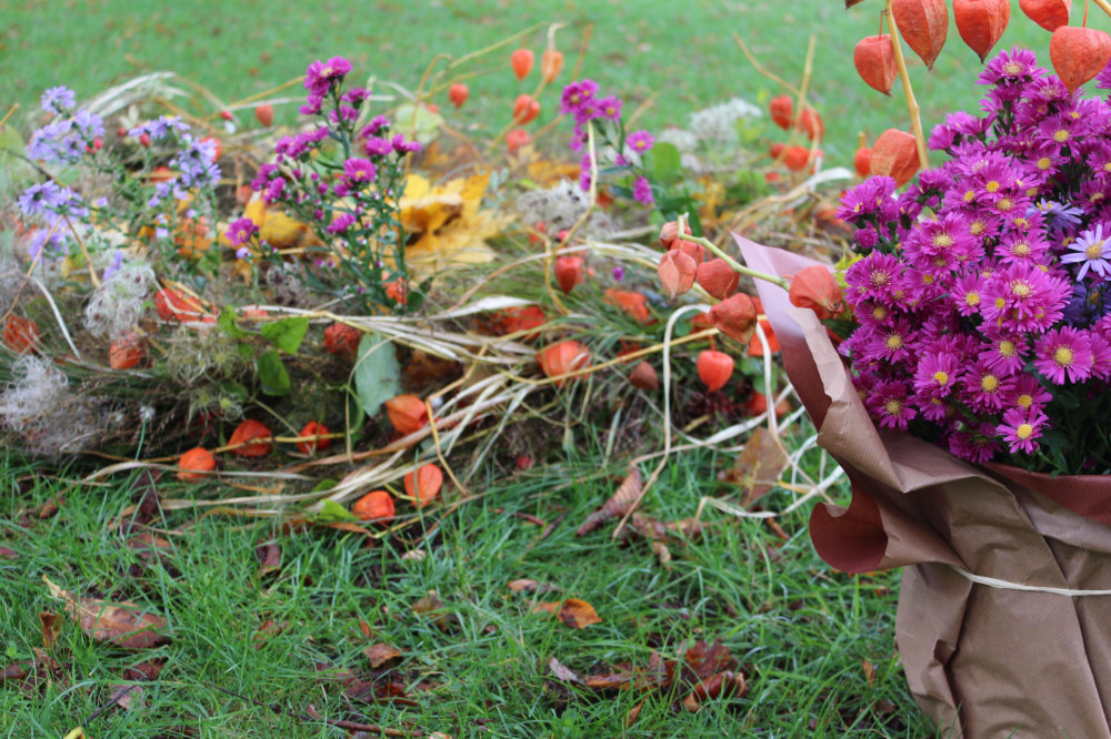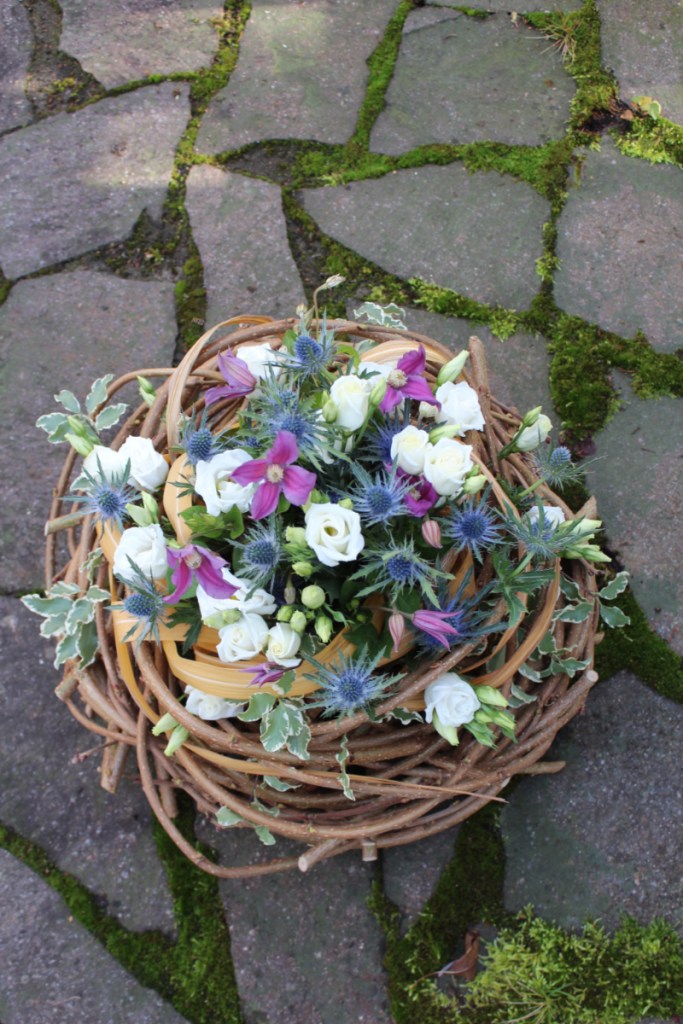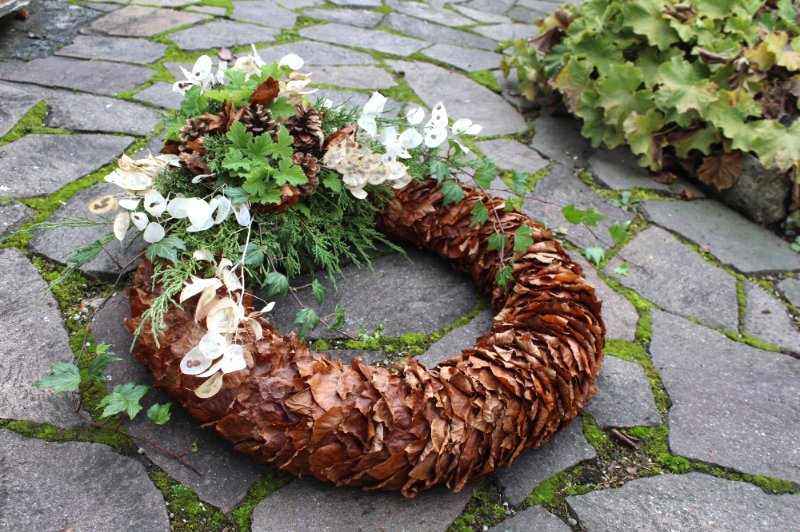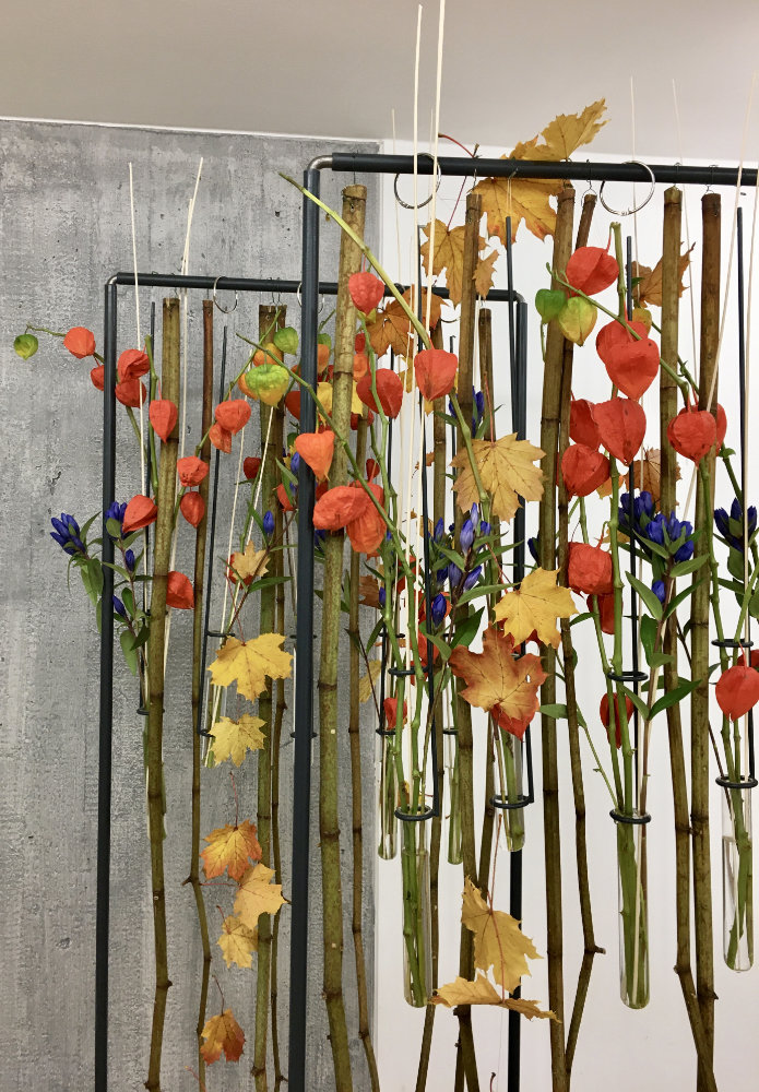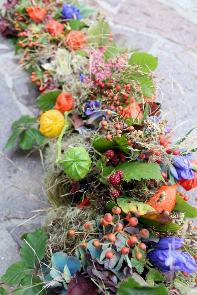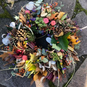 Herbstlicher Kranz umrahmt Kerzen in Beerentönen.Runder Brautstrauß mit Rosen, Eucalyptus und Schleierkraut.Objekte aus Kiefernzapfen, gewebt mit Wickeldraht, mit verschiedenen Füllungen.Wandschmuck: großer Loop mit üppigen Trockenblumen.Gartenobjekt aus verschiedenen Ranken und Zweigen.Knalliger Frühlingsstrauß im März mit Kaiserkrone, Ranunkeln, Anemonen und duftiger Mimose.Manchmal braucht man nur ein paar einzelne Blumen… zum Beispiel französische Tulpen.Gesteck mit Huflattich-Samenständen. Hier will ich durch Fülle die Schönheit dieses ‚einfachen‘ Werkstoffs hervorheben.Herbstlicher Türkranz, gebunden mit aufgefädelten Kastanien.