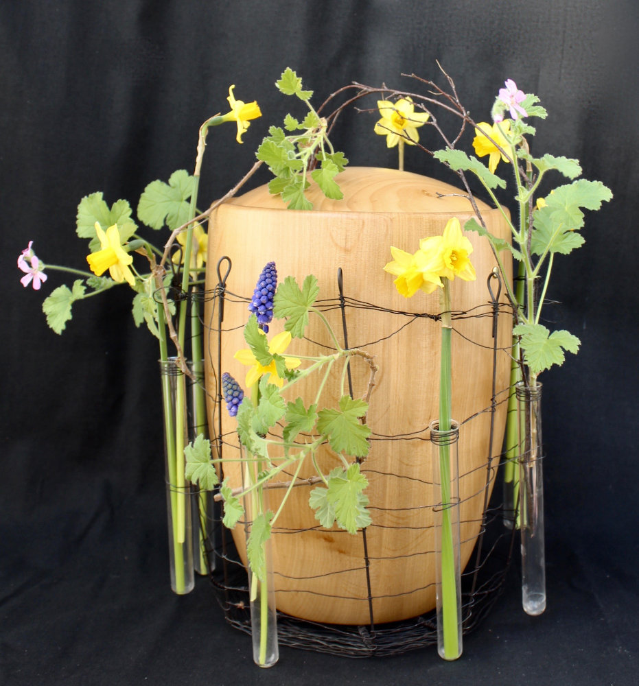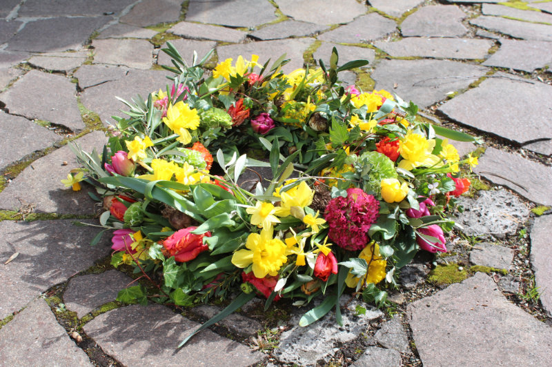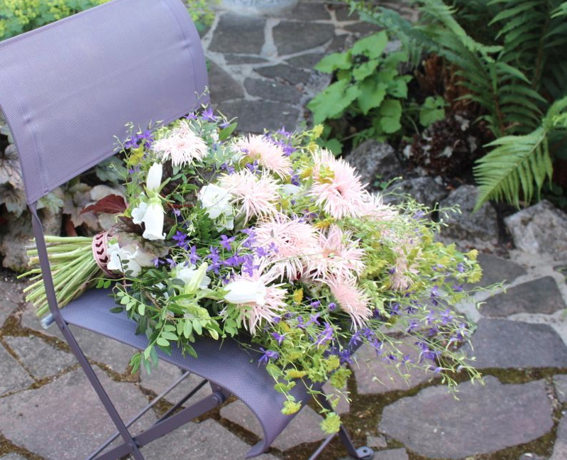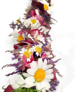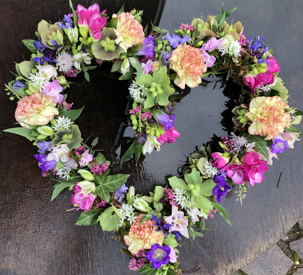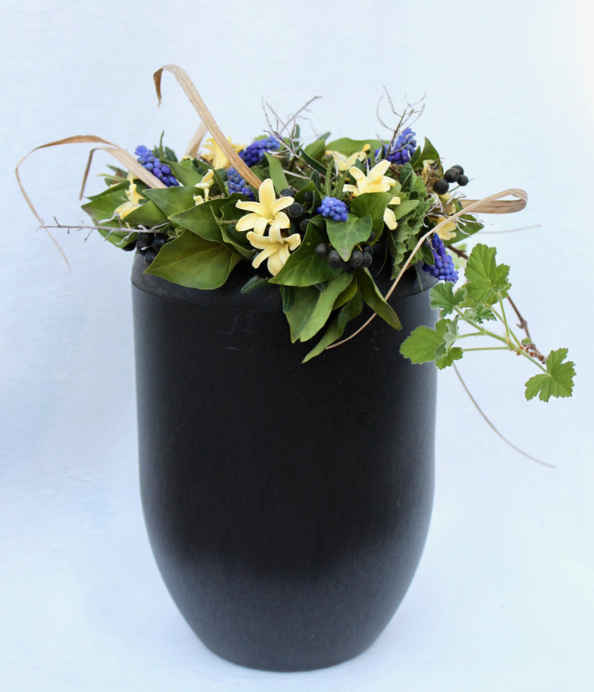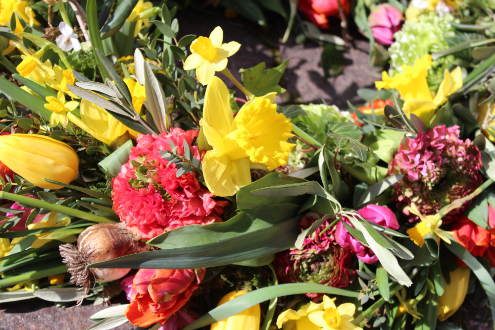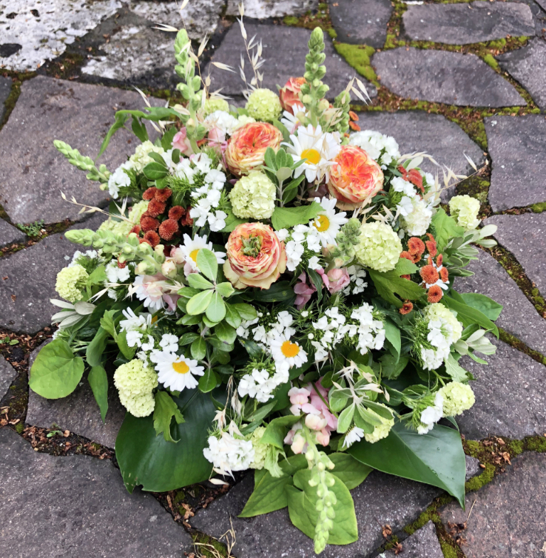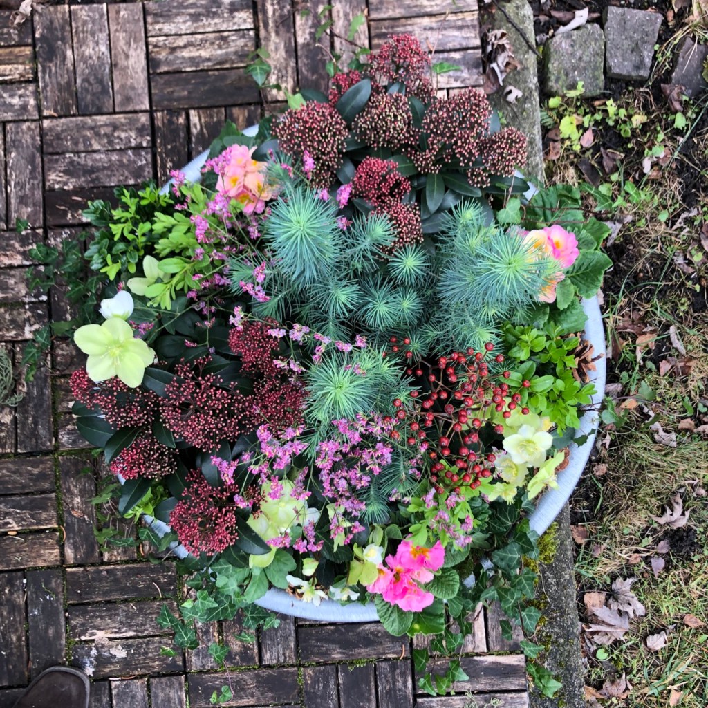 Herbstlicher Kranz umrahmt Kerzen in Beerentönen.Runder Brautstrauß mit Rosen, Eucalyptus und Schleierkraut.Objekte aus Kiefernzapfen, gewebt mit Wickeldraht, mit verschiedenen Füllungen.Wandschmuck: großer Loop mit üppigen Trockenblumen.Gartenobjekt aus verschiedenen Ranken und Zweigen.Knalliger Frühlingsstrauß im März mit Kaiserkrone, Ranunkeln, Anemonen und duftiger Mimose.Manchmal braucht man nur ein paar einzelne Blumen… zum Beispiel französische Tulpen.Gesteck mit Huflattich-Samenständen. Hier will ich durch Fülle die Schönheit dieses ‚einfachen‘ Werkstoffs hervorheben.Herbstlicher Türkranz, gebunden mit aufgefädelten Kastanien.